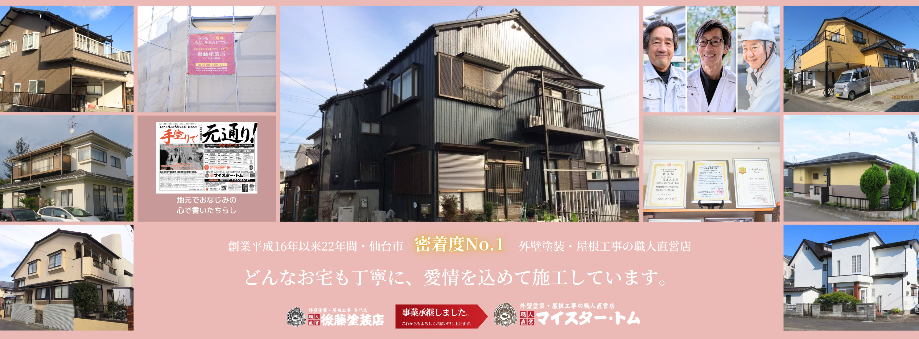 そんなマイスタートムは、2024年11月1日に後藤塗装店から事業承継を受け、さらに多くのお客様に、変わらぬ良質な塗装工事・屋根工事・屋根リフォームをご提供し続けていく所存でございます。