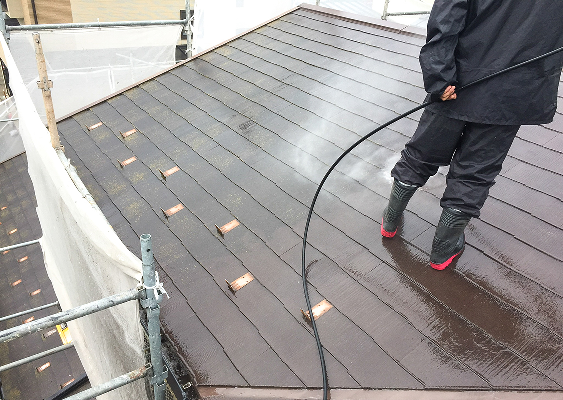 高圧洗浄では、屋根についてしまったコケやカビ、汚れ、前回塗装の塗膜等の不純物などを取り除きます。そうすることで、塗装面が剥がれにくくなります。